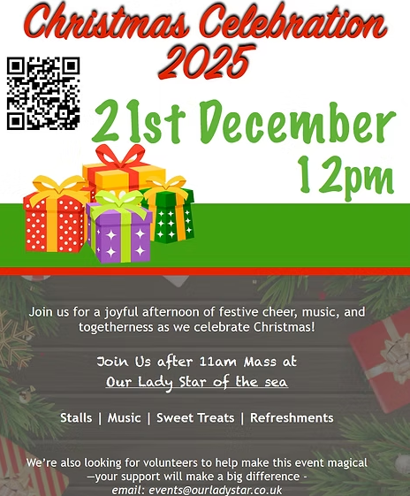 Join us for a joyful afternoon of festive cheer, music, and togetherness as we celebrate Christmas! Join us after 11am Mass at Our Lady Star of the Sea
