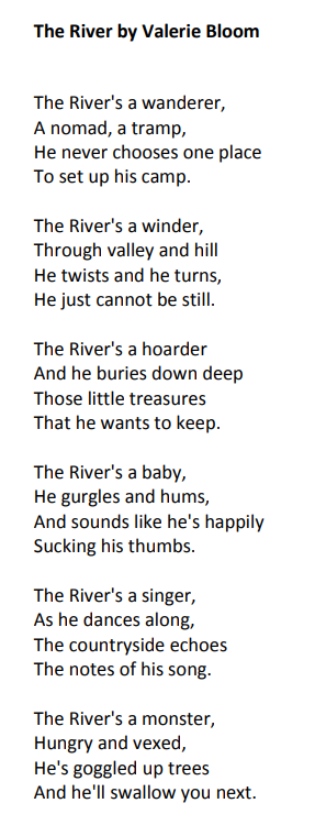 In our writing lessons we are exploring the poem 'The River' by Valerie Bloom. We are developing our knowledge of poetry structure, rhyming couplets and language used to create an engaging poem.