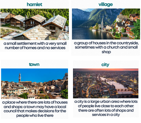 - The four main types of settlements: hamlets, villages, towns and cities.