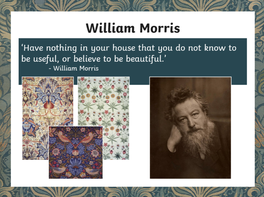 This half-term we are learning how to create prints. We will be looking at the work of William Morris and how we used repeating patterns to make beautiful prints for inside the home.